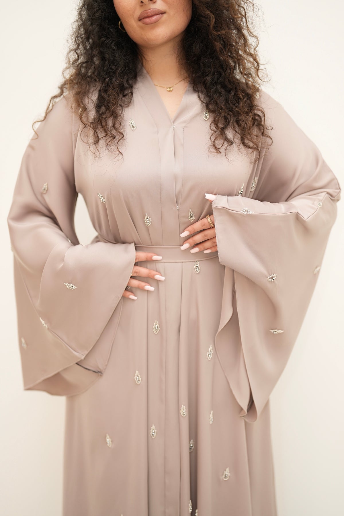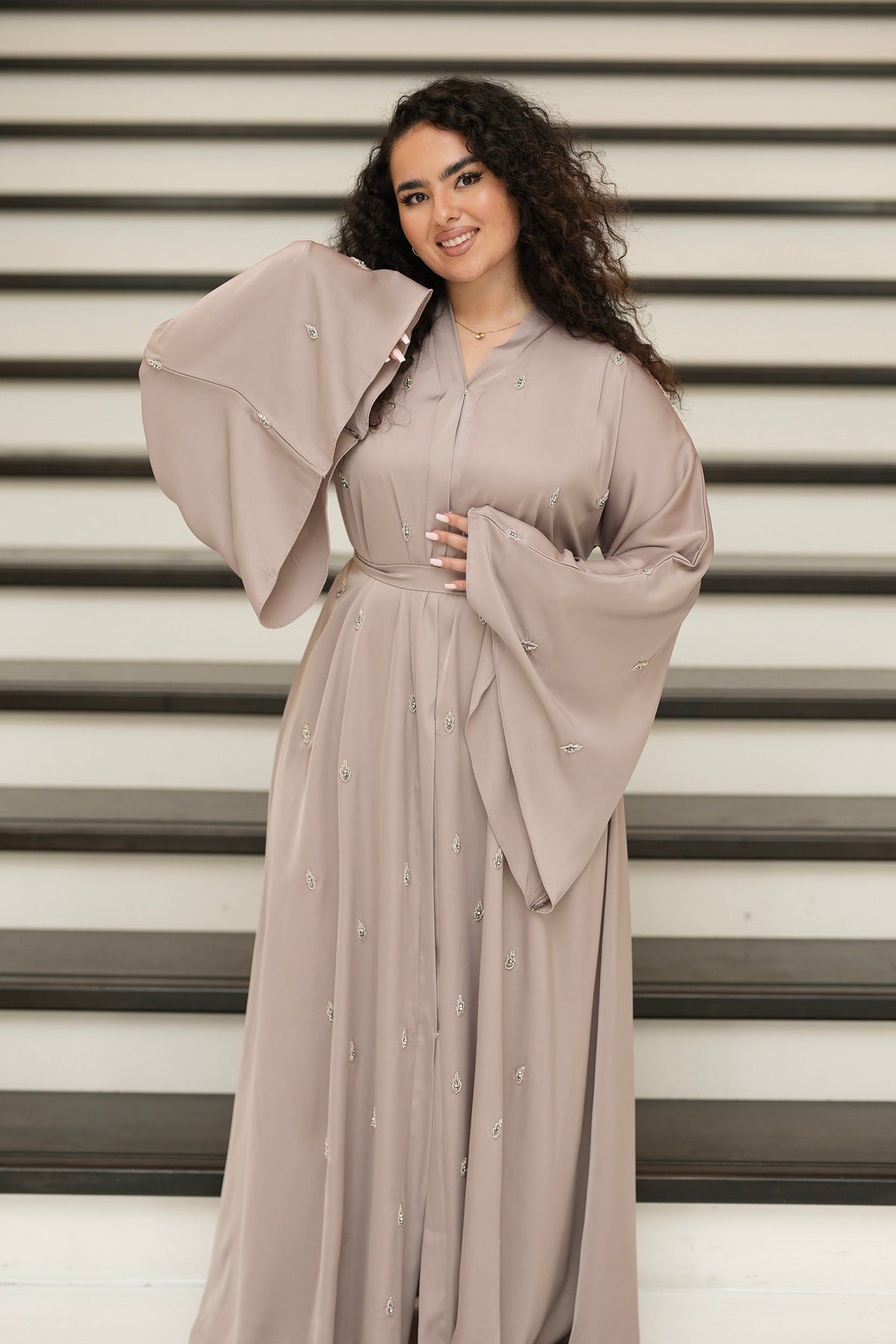 Elegantes 3-teiliges Set – fließendes Kleid mit edlen Details, passender Gürtel und Chiffon-Kopftuch inklusive.